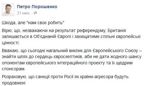 "Жаль, "но нам свое делать". Верю, что, несмотря на результат референдума, Великобритания останется в Объединенной Европе и будет защищать общие европейские ценности", – написал Порошенко у себя в Facebook.