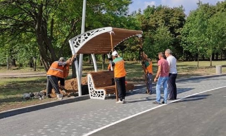В Краматорске начали устанавливать козырьки на скамьях, расположенных вокруг флагштока