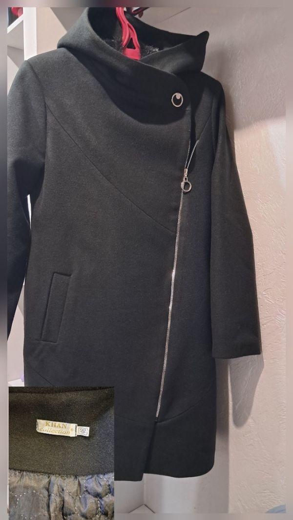Продам чёрное,новое пальто с боковой молнией и капюшоном.